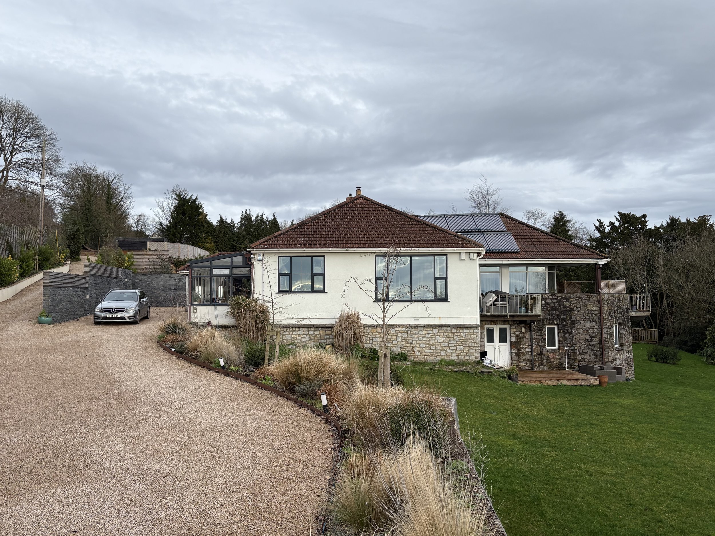This Forever Home is located 10 minutes from Clifton, in Bristol, set in 1.7 acres with views of the coastline and stunning sunsets. Working with a 1930’s bungalow we are in the process of remodelling the whole site to include Yoga Studio overlooking the pond, enclosed swimming pool to encourage daily exercise and 2 bedroomed self contained flat for a future Live-in Carer. The 3000sq ft main house will have the internal layout reconfigured - wide corridors, 3 open plan, single-level zones: day area comprising kitchen/breakfast/dining; play area comprising pool room/cinema room opening out onto the terrace with outside kitchen/dining seating, leading to the swimming pool; evening area comprising of library and lounge opening out onto the main terrace with views out to the coast. 3 additional bedrooms will be added all with separate en-suites and the master with have a full dressing room adjoining it.